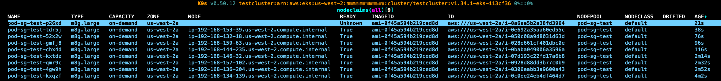 It’s finally time to reproduce the problem for real. We’ll deploy a new pod which requests 1Ki more memory. The actual allocatable memory of an m8g.large instance doesn’t change and it’s still 6,848,388Ki. However, karpenter will start to judge m8g.large instance will have slightly more allocatable memory, and it is qualified to schedule the new pod. As a result, Karpenter will continuously create m8g.large nodes